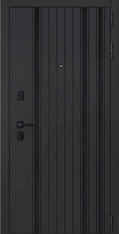 Порошковое покрытие "муар черный". Панель МДФ 10 мм (цвет "черная шагрень"). Объемная фрезеровка. Вертикальные вставки из пластика 3 шт (цвет "черный"). Наличник МДФ 80 мм.